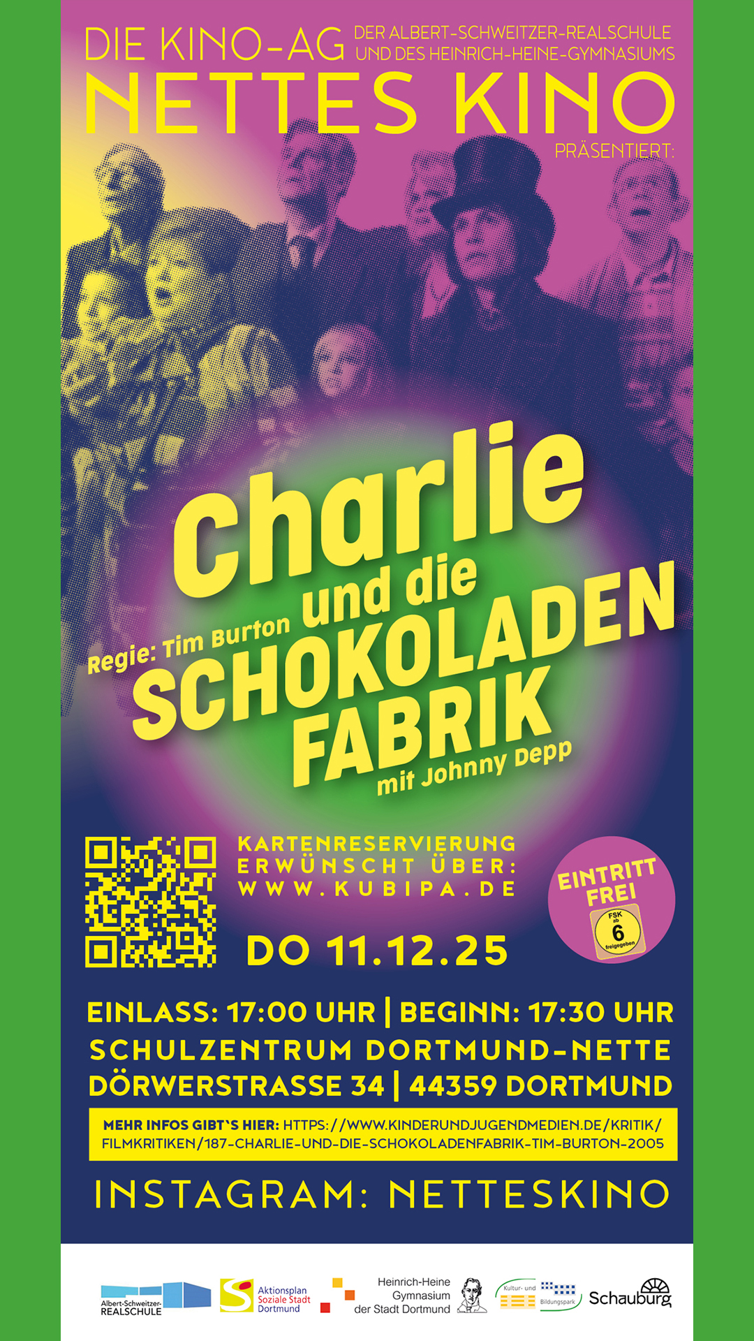 Unser Weihnachtsfilm ist Kult! Den kann man immer wieder sehen und Neues entdecken bei einer Achterbahnfahrt durch eine bunte Süßigkeitenwelt. Denn Willy Wonka ist weltberühmt und seine Schokolade die beliebteste bei Groß und Klein. Doch lange hat er sich nicht mehr öffentlich blicken lassen. Umso größer ist die Spannung, als er 5 Goldene Tickets in seinen Tafeln köstlichster Schokolade versteckt. Mit diesen Tickets darf man für einen Tag seine geheimnisvolle Fabrik besuchen. Charlie, dessen Eltern arm sind, hat großes Glück und findet eines dieser Tickets – die Eintrittskarte in das sonderbare Reich des Willy Wonka!