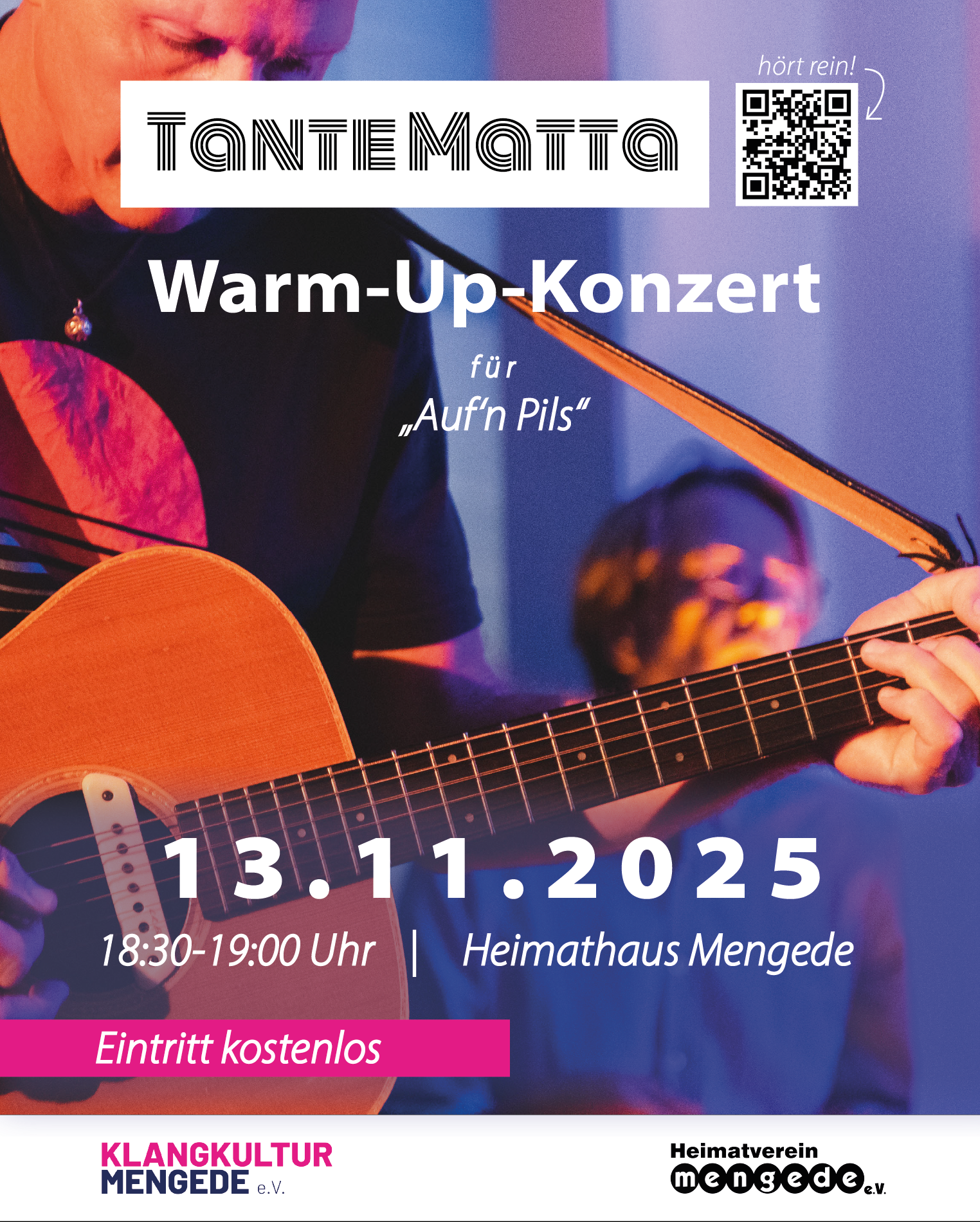 13. Novmber 2025: Tante Matta spielt diesmal zu dritt, live, 30 min und akustisch als „Warm-up für die beliebte Veranstaltungsreihe „Auf´n Pils“.  Beginn ist 18.30 Uhr im Heimathaus in Mengede. Der Eintritt ist kostenlos.